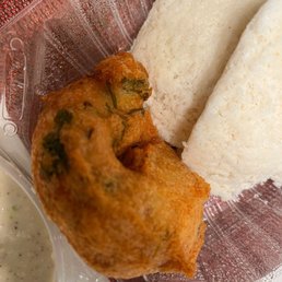 The interior is very bare bones with a water pitcher already on the tables. Don't let this details fool you though. The service and chefs are fast. Servers make sure the pitcher is full. The food here is very flavorful and such good value especially in this economy. I ordered the following: * Sambar vada $8.00 * Tomato Onion Chili Uthappam - 10.50 * Filtered coffee $2.99 I'm not a fan of coffee but I am now of Indian filter coffee. It's not bitter. There's milk and chicory. I added two packets of sugar.